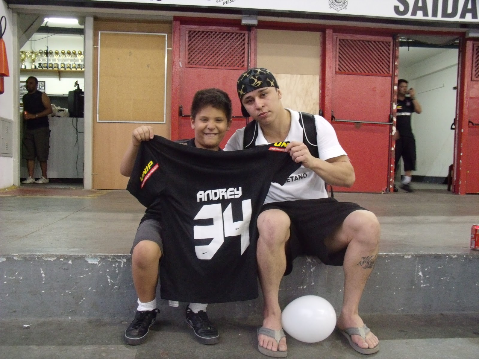 | Andrey presenteia torcedor Vitor com sua camisa |